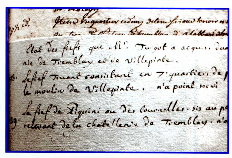 Inséré dans le registre des ensaisinements, ce document fait état de deux acquisitions de biens nobles effectuées par Michel,Étienne Turgot, alors prévôt des marchands de Paris. Il a acquis, en 1739, « le fief de Piquini ou des Tournelles au Petit Tremblay, relevant de la châtellenie de Tremblay. » La mention « n’a point servi » est portée en regard de l’inscription de l’acte d’acquisition.