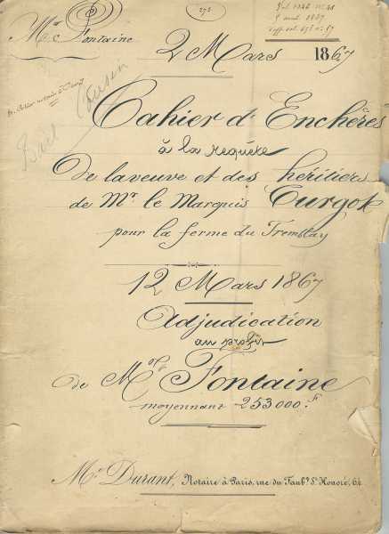 La ferme du Tremblay appartient depuis deux siècles à la famille Turgot. L’acte précise qu’elle est mise en vente après le décès, le 22 octobre 1866 à Versailles, de « Louis, Félix, Étienne, marquis Turgot, ancien ministre des Affaires Étrangères, ancien ambassadeur de France auprès la République helvétique, sénateur, grand-croix de l’ordre impérial de la Légion d’Honneur. » Pour apurer la succession, la vente est effectuée à la demande de sa veuve,Louise, Napoléon, Mouton deLobau, de sa fille Marie, Félicité, Stéphanie Turgot, épouse de Jean Joseph Gustave Dubois del’Estang, conseiller référendaire de première classe à la Cour des comptes, de son fils Jacques, Georges, Louis marquis Turgot. (3)