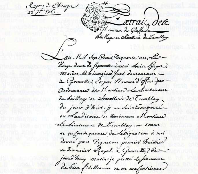 « Je me suis transporté en l'auditoire et par devant Monsieur le Lieutenant de Tremblay, ou étant et en conséquence de l'assignation à moi donnée par Vigneron, premier huissier audiencier Royal à Gonesse, ce jourd’hui matin j'ai prêté le serment de bien fidèlement et en ma conscience procéder à la visite de la personne de Jacques Descouën berger demeurant au dit Tremblay, ensuite duquel serment je me suis transporté à la maison du dit Jacques Descouën où étant j'ai trouvé le dit Jacques Descouën au lit, et après l'avoir vu et visité de toute part, j'ai reconnu il la partie supérieure du coronal une cicatrice de deux pouces de long, à la partie supérieure de l'occipital, une haute plaie d'un pouce qui ne peut être guérie que pendant 6 jours, plus la quatrième vraie côte du côté gauche enfoncée et ecchymosée antérieurement, le tout causé par coups de bourrade de fusil, coups de crosse et autres instruments semblables, ce qui met le malade en grand danger, lesquels coups et plaie ont occasionné la fièvre au dit Descouën. Lequel ne peut être guéri que de trois semaines, sauf autres accidents, ce que je certifie véritable, en foi de quoi j'ai signé et délivré la présente. »