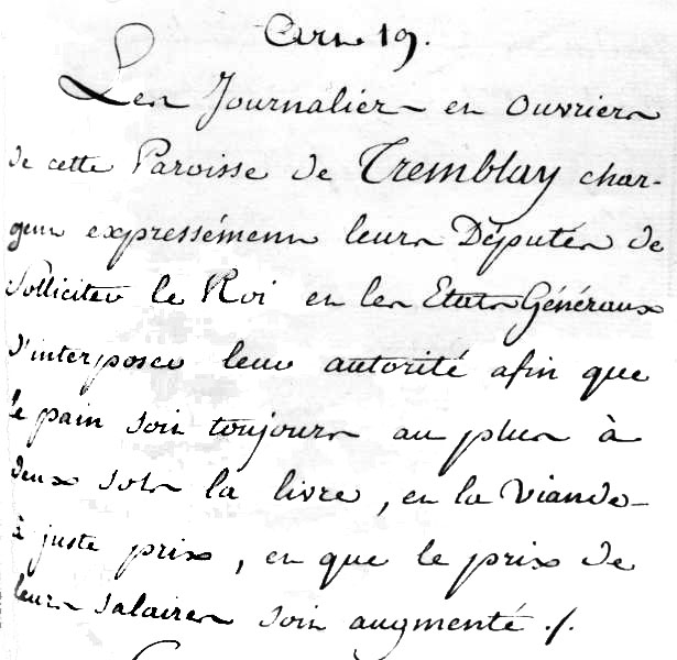 Art. 19.Les journaliers et ouvriers de cette paroisse de Tremblay chargent expressément leurs députés de solliciter le Roi et les Etats généraux d'interposer leur autorité afin que le pain soit toujours au plus à 2 sous la livre, et la viande à juste prix, et que le prix de leur salaire soit augmenté.