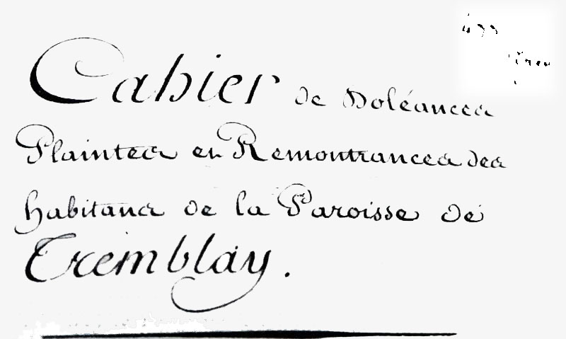 Le dimanche de Pâques, 12 avril 1789, le curé SÉmilliard lit, au prône, l'ordonnance du Prévot de Paris relative à la nomination des députés du premier degré. C’est le lendemain que se réunissent les Tremblaysiens qui vont rédiger le cahier sur lequel nous nous penchons aujourd'hui. Ils comprennent parmi eux des représentants de toutes les couches sociales, y compris les plus défavorisées, comme l'atteste, à côté du paraphe des 36 signataires, la mention de la présence de ceux « qui ont déclaré ne savoir écrire ni signer. »