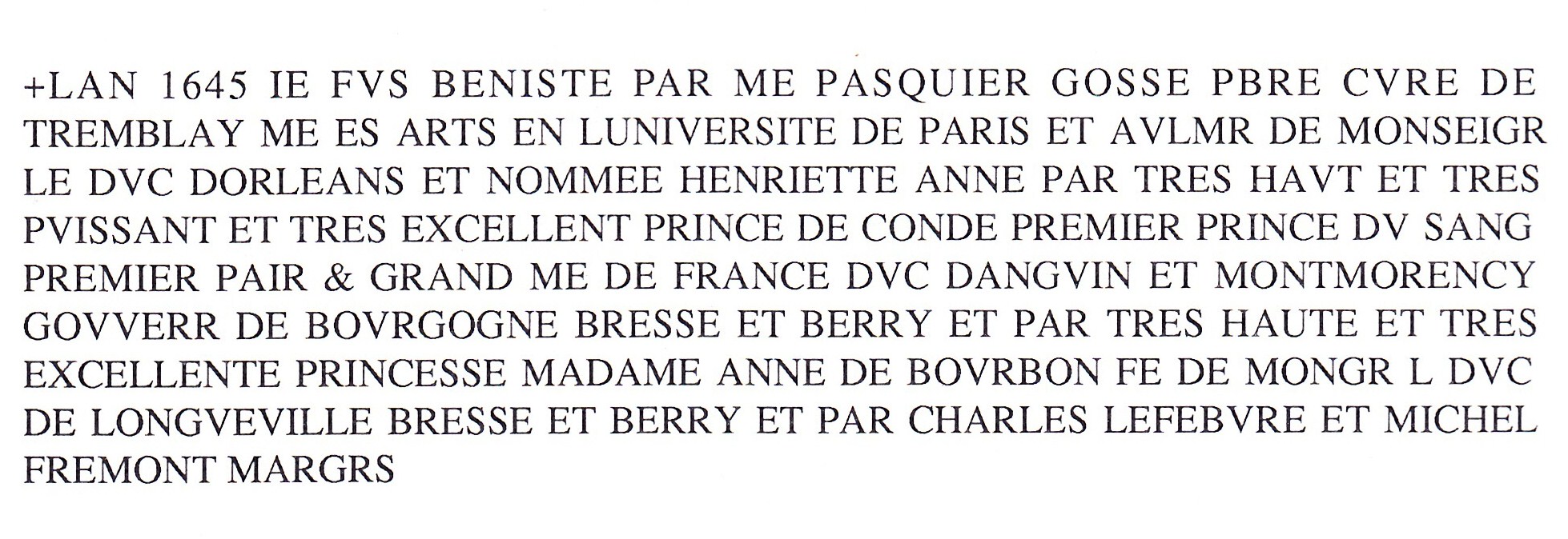A LA GLOIRE DE DIEV ET A LA MEMOIRE ETERNELLE DE MRE PASQVIER GOSSE VIVANT CVRE DV TREMBLAY DECEDE LE 26 NOVEMBRE 1646 AAGE DE 40 ANS M. THOMAS IACQUES SON NEVEV SECRETAIRE ORDINRE DE LA FEVE REINE MERE DV ROY, A DONNE A L'ŒVVRE DE CEANS SIX LIVRES CINQ SOLS DE RENTE FONCIERE ET TROIS QVARTIERS DE TERRE POVR LA FONDATION A PERPETVITE DE DEVX MESSES HAVTES DE Requiem AVEC LE NOCTVRNE LE Libera Deprofundis ET ORAISONS, LA PREMIRE LE DIT IOVR DV DECEDS DV DIT SR GOSSES POVR LE REPOS DE SON AME. ET LA 2ME A PAREIL IOVR QV'ARRIVERA CELVY DVDIT SIEVR IACQUES ET D'VN SALVT SOLEMNEL QVI SE DIRA LE IOVR DE SCT MEDARD, AVEC L'Antienne DV IOVR L'Hymne DE Pange Lingua, Magnificat, L'Ave Maris Stella VN Deprofundis ET ORAISONS, A SON INTENTION ET DE SES PARENS, SVIVANT QVIL ET PORTE PAR CONTRAT PASSE PARDEVANT DESPRIEZ ET SON CONFRERE NOTTAIRES A PARIS LE 30EME IOVR DE DECEMBRE 1693