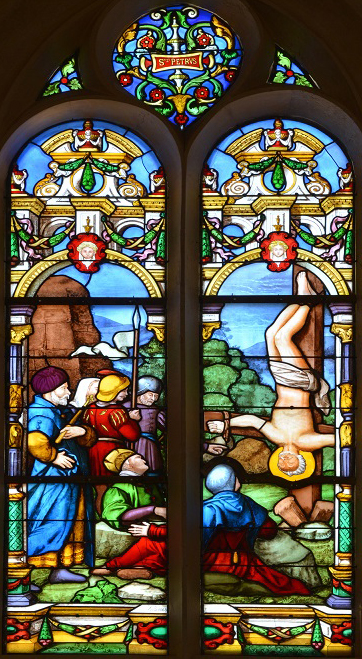 La série se termine sur la crucifixion de Saint PIERRE. Conformément à la tradition, le martyr est représenté la tête en bas. Certaines parties de ce vitrail, très dégradées, notamment le visage du saint dont on ne distinguait plus les traits, ont été refaites. L’Évangile de JEAN fait clairement allusion au martyre de PIERRE (JEAN XXI,18-19).