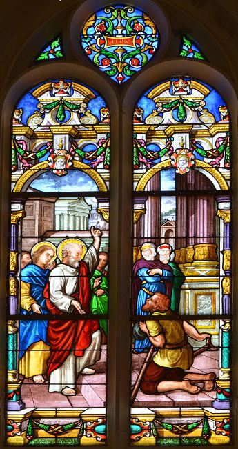 Le vitrail suivant a pour sujet le Boiteux de la Belle Porte (Actes des Apôtres, III : 1-8). PIERRE qui se rend au Temple de Jérusalem, pour prier en compagnie de JEAN, guérit un infirme, boiteux de naissance, à la porte du Temple dite la Belle Porte. Interpellé par l’infirme, PIERRE lui dit : « Je n’ai ni argent, ni or ; mais ce que j’ai, je te le donne : au nom de JÉSUS CHRIST de Nazareth, lève-toi et marche. »