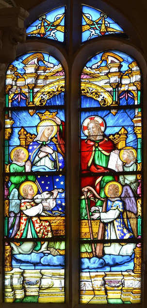 La VIERGE est vêtue d’un manteau bleu, constellé d’étoiles, le CHRIST d’un manteau de pourpre, insigne de la royauté. Le drapé de ces deux vêtements, à la différence de celui des autres vitraux, est à peine esquissé, ce qui confère aux personnages une certaine raideur.