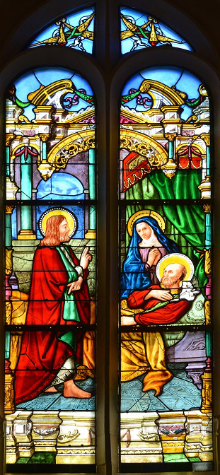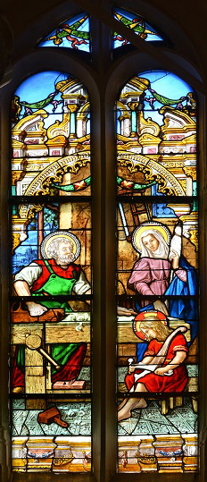 Le premier vitrail de la chapelle latérale sud de la 9ème travée est dédié à la Sainte Famille. JOSEPH charpentier est représenté dans son âge mur. Penché sur son établi, il travaille à la varlope une pièce de charpente.