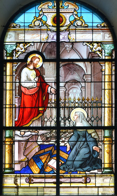 Le vitrail nord de la première travée évoque l’une des trois apparitions du CHRIST à sainte MARGUERITE-MARIE. Entrée au couvent de la Visitation de Paray-le-Monial, en 1672, MARGUERITE-MARIE ALACOQUE y connut trois grandes visions, entre 1673 et 1675. Elle reçut pour mission de répandre la dévotion du Sacré-Coeur de Jésus. Son message rencontra au XVIIIème siècle une vive opposition des milieux jansénistes, puis connut un écho favorable au siècle suivant, comme en témoigne le vitrail qui lui est ici consacré, plusieurs dizaines d’années avant sa canonisation qui n’intervint qu’en 1920.