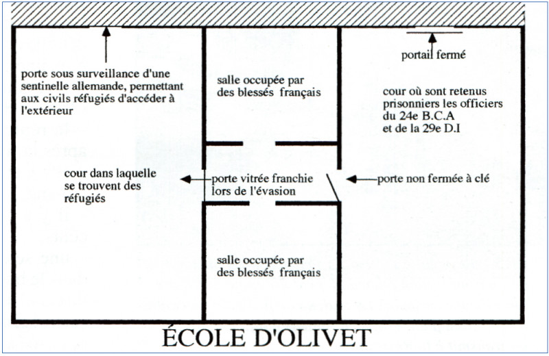 Au moment de repartir, des officiers allemands font monter certains officiers du bataillon, dont je suis, dans des voitures conduites par des soldats allemands. On me fait monter dans une voiture genre command-car, dans laquelle se trouve un officier allemand qui se montre correct. On roule jusqu’à Olivet faubourg d’Orléans, et je suis déposé dans la cour d’une école dans laquelle se trouvent d’autres officiers du bataillon et de la division.