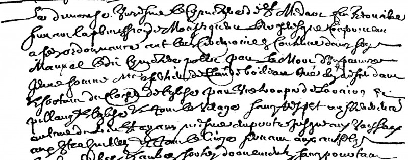 Le dimanche unziesme, le cymetière de saint Medart fut réconcilié suivant la permission de Monseigneur l’archevesque conformément à son ordonnance, avec les cérémonies contenues dans son manuel. Ledit cymetière pollué par la mort d’un pauvre jeune homme, Me chertier de Claude Boileau, tué en descendant et sortant du clocher de l’église, par une troupe de Loraings pillang et l’église et tout le vilage sans respect ny reverence aulcune du lieu saint et ayans mesme emporté jusque aux vaissaux aux saintes huilles et tout le cierge servant aux authelgs, simples aubes et autres sortes