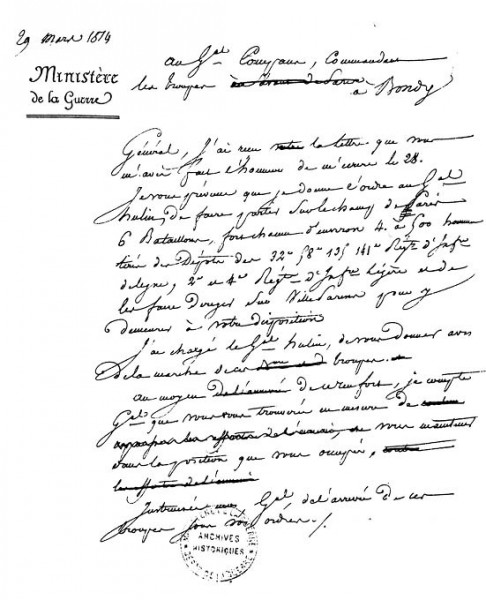 Lettre du ministre de la Guerre au général Compans, datée du 29 ars 1814 au Général Compans, Commandant les troupes (4 mots rayés) à Bondy. SHD C2.186