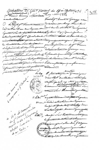 Le document, écrit au crayon, n'est pas de a main du général. Henry Houssaye le cite sous le nom de journal du général Vincent dans 1814 (ouvrage cité, page 388.) Nous transcrivons le passage concernant les batailles de Claye-Montsaigle et Vert-Galant, en rectifiant les erreurs de date d’un document rédigé de mémoire, a posteriori.