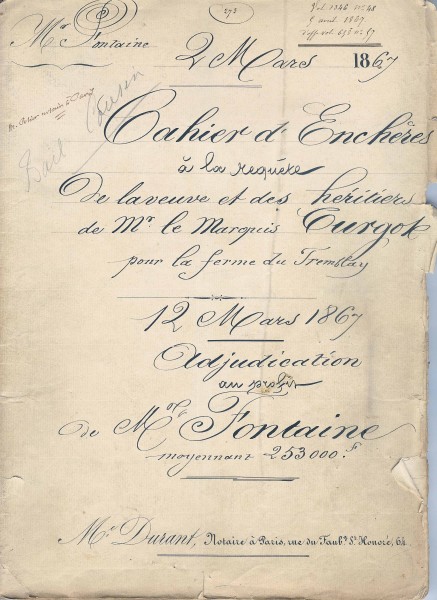 Le 2 mars 1867, après le décès de Louis, Félix, Etienne Turgot, survenu à Versailles le 22 octobre 1866, sa veuve et ses deux enfants confient Me Durand et Me PÉan de Saint-Gilles, notaires à Paris, la vente de la ferme du Tremblay.