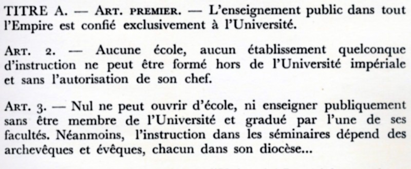 La loi Falloux, votée le 15 mars 1850, fait entrer au Conseil royal de l'Université quatre archevêques ou évêques, trois ministres des autres cultes. Les instituteurs publics doivent désormais enseigner le catéchisme