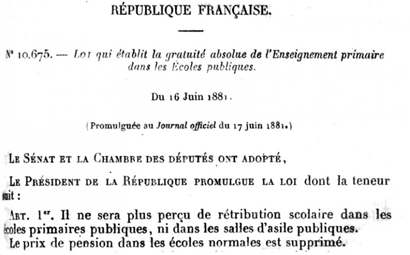 À l'avènement de la IIIème République, l'école primaire s'est organisée, mais elle n'est pas sécularisée. Elle est subordonnée aux cultes qui la contrôlent, quand ils ne la dirigent pas. C'est pourquoi, il est essentiel, pour les Républicains de la doter des fondamentaux sans lesquels elle ne peut devenir l'école de la République, c'est-à-dire celle de tous les citoyens, sans distinction de classe sociale ou de confession religieuse. Ses principes de base : laïcité, gratuité, obligation peuvent seuls permettre cet objectif