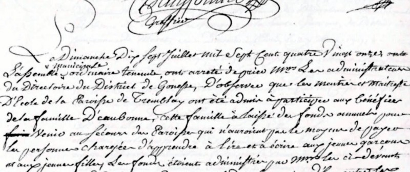 Le 12 août 1787, acte fondateur de la démocratie locale à Tremblay, l’Assemblée générale de la paroisse est réunie afin de désigner l’assemblée municipale. La démocratie doit prendre en compte l’analphabétisme d’une partie des citoyens. Les signatures comparées de ceux qui maîtrisent l’écriture et de ceux qui peinent à écrire leur nom atteste la disparité du niveau d’instruction. Le suffrage universel ne dit pas exclure les analphabètes :