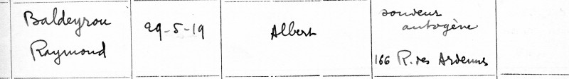 Inscription Raymond Baldeyrou, école baraque du Vert-Galant, année scolaire 1928-1929. Le document mentionne l'adresse et la profession du père (soudeur autogène, chez Citroën)