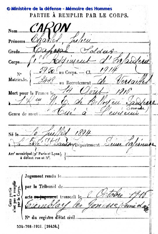 CARON Charles, Julien, mort pour la France le 14 août 1916