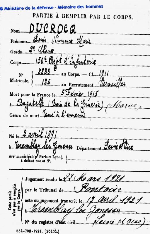 DUCORCQ Louis, Numance, Marie, mort pour la France le 5 février 1915