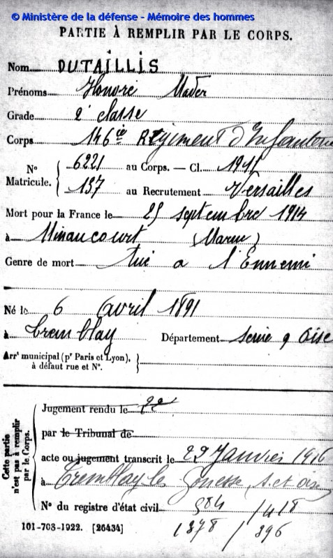 DUTAILLIS Honoré, Mader, mort pour la France le 25 septembre 1914