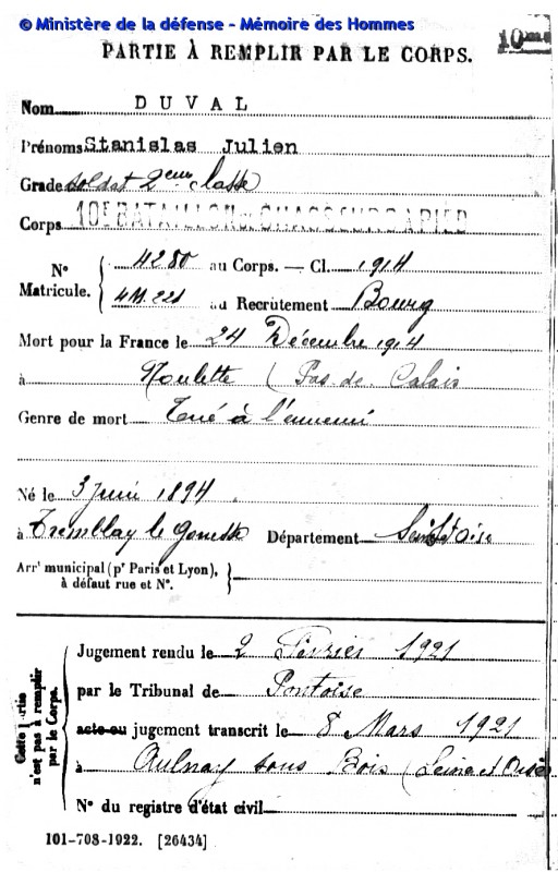 Fils de Pierre, Henri Duval et de Elvire Delahaye domiciliés à Tremblay-Lès-Gonesse, Stanislas, Julien Duval nait le 3 juin 1894, au domicile de ses parents. Sa fiche matricule signale des cheveux blonds, yeux châtains, front large, nez droit, en saillie sur un large visage marqué d’une cicatrice sur la joue gauche, mais ne dit rien de sa taille et de son degré d’instruction