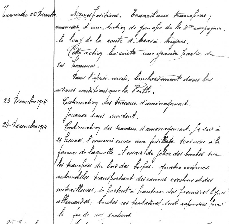« 24 décembre : Continuation des travaux d’aménagement. Le soir à 21 heures l’ennemi ouvre une fusillade très vive à la faveur de laquelle il essaie de jeter des bombes sur les tranchées du bois des Boches. Quatre voitures automobiles, transportant des canons révolvers et des mitrailleuses, se portent à hauteur des premières lignes allemandes ; toutes ces tentatives sont repoussées par le feu de nos sections. »