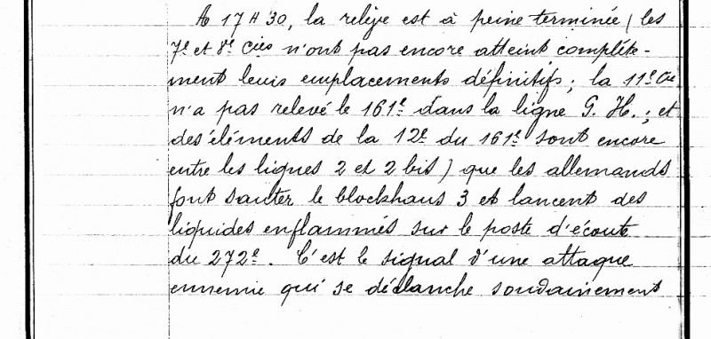 « 17 h 30 la relève est à peine terminée, que les allemands font sauter le blockhaus 3 et lancent des liquides enflammés sur le poste d’écoute du 272e. C’est le signal d’une attaque ennemie qui se déclanche soudainement sur tout le front des 10e, 9e, 12 e compagnies avec une violence extrême. Au même moment l’artillerie fait sur les lignes 4 et 1Nbis un barrage d’une intensité inouïe. Le secteur a peu de munitions (600pétards seulement à la réserve) ; à Beaumanoir il n’y en a pas davantage. Un moment surprises, les Cies se ressaisissent et tiennent bon jusqu’à 18 h 15 ; mais à ce moment les munitions commencent à manquer.