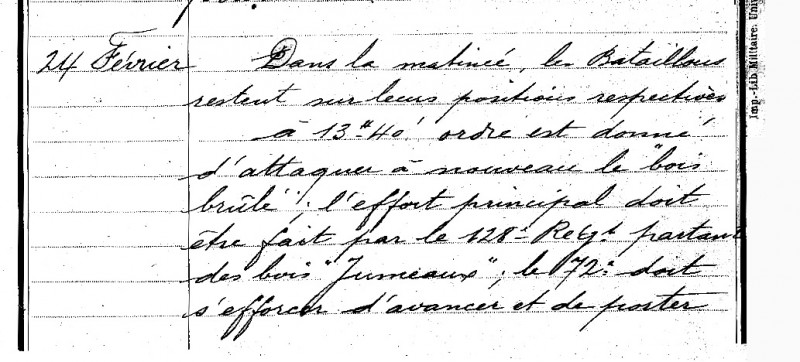 A 13 h 40 ordre est donné d’attaquer à nouveau le bois Brûlé, l’effort principal doit être fait par le 128e RI partant du bois Jumeaux. Le 72e doit s’efforcer d’avancer et de poster sa droite en avant de façon à se relier au 51e RI vers le bois Rabougri.