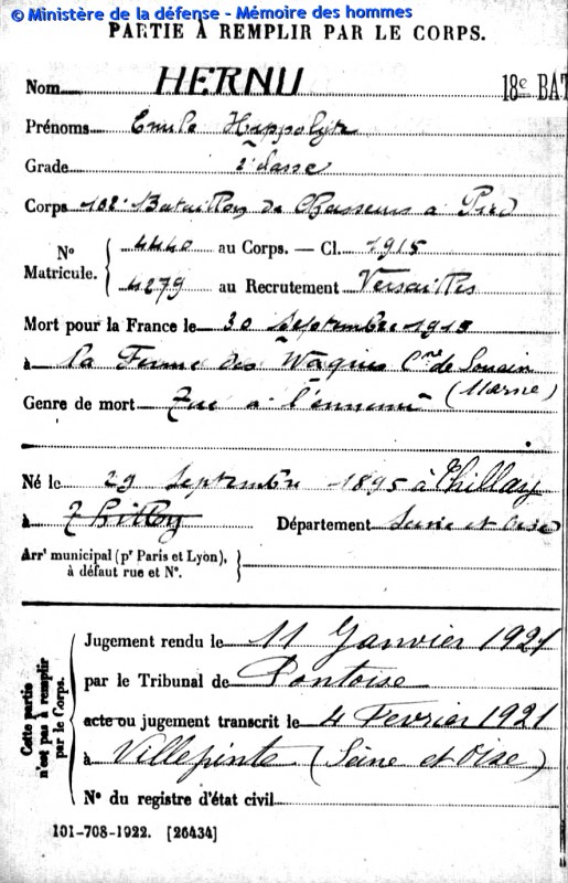 HERNU Emile, Hippolyte, mort pour la France, le 30 septembre 1915