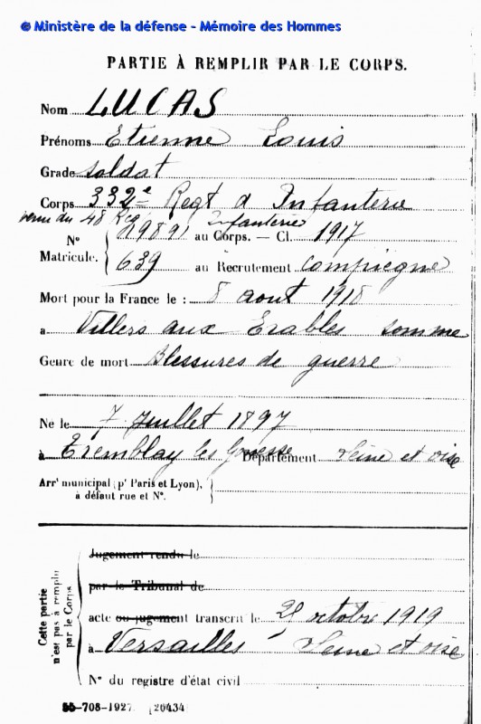 LUCAS Etienne, Louis , mort pour la France le 8 août 1918