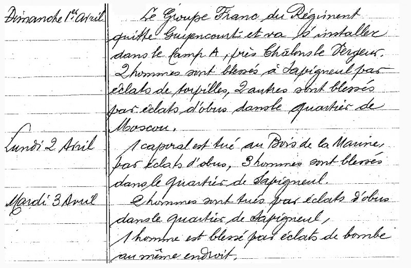 Le groupe franc du régiment quitte Guyancourt et va s’installer dans le camp A, près de Châlon le Verger 2 hommes sont blessés par éclat de torpilles à Sapigneul, 2 autres sont blessés par éclat d’obus dans le quartier de Moscou