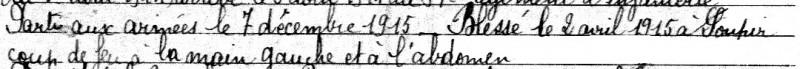 la fiche matricule de Léon, Louis Mavré détaille les blessures qui ont frappé Léon, Louis, Marvé, le 3 avril 1915