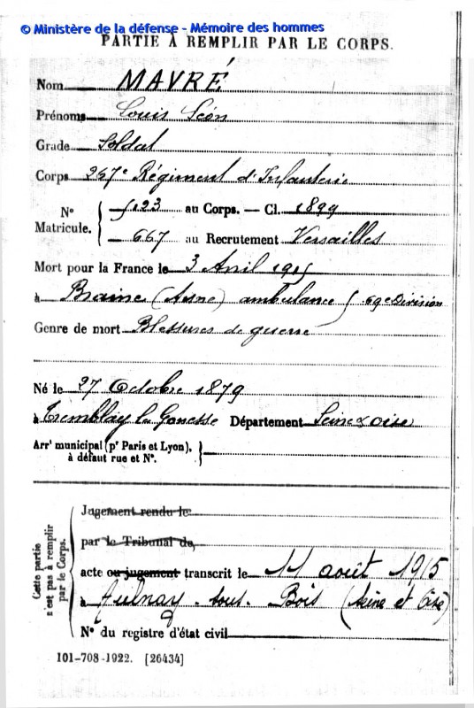 MAVRÉ Louis, Léon, mort pour la France le 3 avril 1915 à Braisne