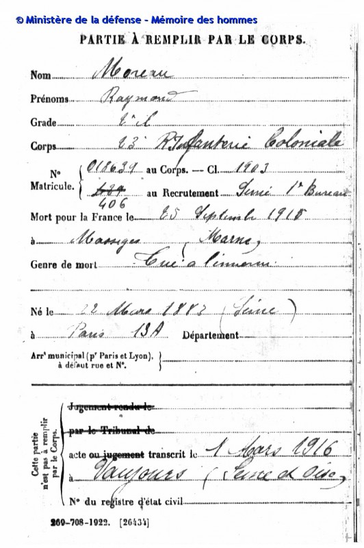 Fils de François MOREAU et d’Antonie, Julie DUBAR, Raymond MOREAU est né le 23 mars 1883 à Paris, dans le 13e arrondissement, selon 1a fiche matricule de recrutement militaire. Notons toutefois que 1’acte de décès, édité par le ministère de la Défense dans Mémoire des Hommes, situe sa naissance au 22 mars. I1 exerce la profession d’horticulteur, a des cheveux et sourcils châtains, des yeux noisette, un visage ovale et mesure un mètre soixante-et-un. Sa fiche matricule comporte une omission, elle ne mentionne pas son niveau d’instruction.