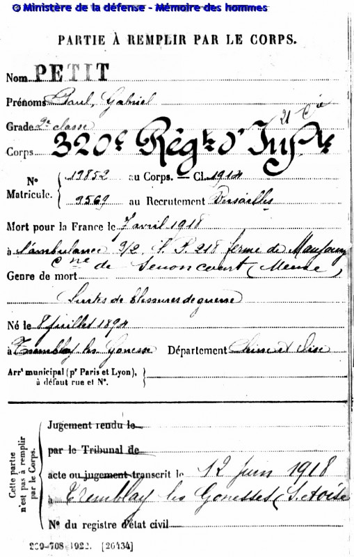 Fils de Joseph, Amédée PETIT et de Juliette, Henriette HABRANT domicilies à Tremblay-Lès-Gonesse, Paul, Gabriel PETIT est né le 6 juillet 1894, au domicile de ses parents. I1 exerce la profession de charretier agricole, lorsqu’il est recensé par 1’autorité militaire. I1 a des cheveux châtains, des yeux marron, un long visage dans lequel on remarque un menton volontaire. Il mesure un mètre soixante six, ne sait ni lire, ni écrire, selon sa fiche matricule. Le Conseil de révision du canton de Gonesse l’inscrit sous le n° 150 et le classe dans la 1ère catégorie de la liste, en 1914. Il est incorporé au 29ème régiment d’artillerie de campagne à compter du 5 septembre 1914. Arrivé au corps le même jour, il est fait canonnier de 2ème classe. I1 est ensuite muté au 118ème régiment d’infanterie, le 16 octobre 1914. Parti au front le 11 novembre 1914, i1 est blessé à Tahure le 25 septembre 1915. Reparti aux armées le 20 octobre 1915, i1 est à nouveau blessé à Tahure « plaie avant bras droit par balle, avec fracture du cubitus ». Rentré au dépôt le 13 mars 1916, il passe devant la commission de reforme de Quimper le 22 mars 1916. Elle lui accorde un mois d’incapacité, mais le déclare apte au service armé. Passé au 320ème régiment d’infanterie, le 19 juillet 1916, il est engagé sur divers fronts, notamment celui de Verdun. Evacué blessé le 6 avril 1918, « région temporale droite par éclat d'obus, fracture du crâne, » il meurt le 7 avril 1918 dans l’ambulance 9/2 à la ferme de Maujours, commune de Senoncourt, Meuse. Au cours de ses divers engagements, il s’est fait remarquer par son courage. Il est cité à trois reprises à l’ordre de la division et décoré de la médaille militaire.