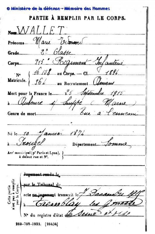 WALLET Marie, Edmond, Osias, mort pour la France le 27 Septembre 1915