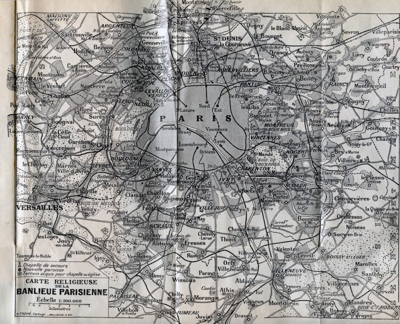 Implantation des lieux du culte en banlieue - carte extraite de Le Christ dans la banlieue Pierre Lhande, Plon 1927