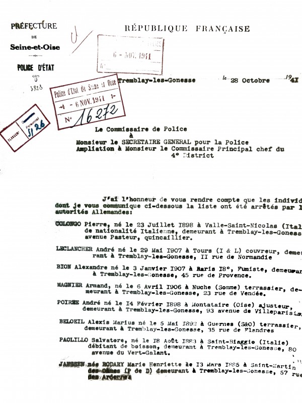 Rapport du commissaire de police de Tremblay-lès-Gonesse, en date du 28 octobre 1941. Pierre Colongo figure en tête de liste des personnes arrêtées par les Allemands.
