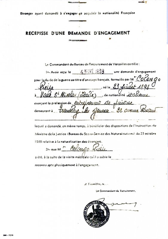 Attestation d'une demande d'engagement, en date du 4 novembre 1939, délivrée à Pierre COLONGO