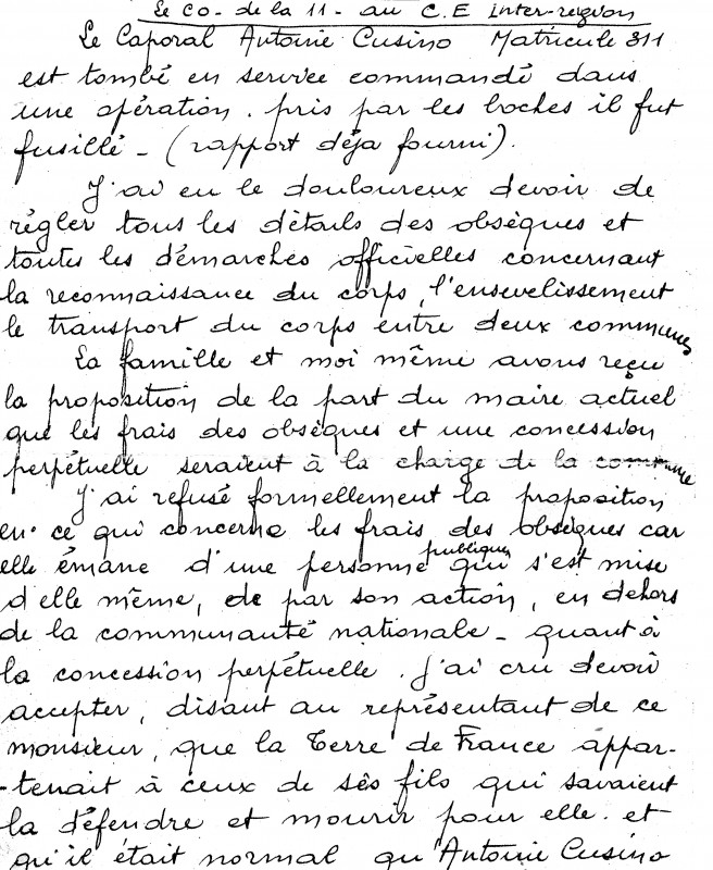Obsèques d'Antoine Cusino : rapport de Fernand Dive dit Gourget, commandant de la 11e région FTPF