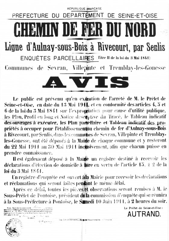 Enquête publique pour la créationde la ligne de chemin de fer Aulnay-sous-Bois-Rivecourt, par Senlis, 1911
