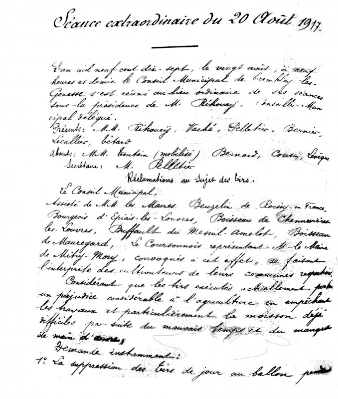L’an 1917, le vingt août, à 9 heures et demie le Conseil municipal de Tremblay-lès-Gonesse s’est réuni au lieu ordinaire de ses séances, sous la présidence de M. Rihouheÿ, Conseiller municipal délégué.