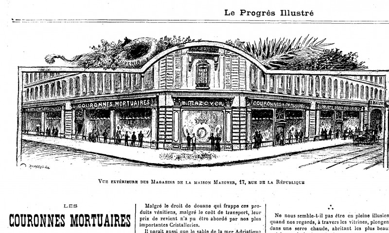 « Je conduirai mes lecteurs et mes aimables lectrices surtout, à qui incombe le choix et l’achat de ces objets commémoratifs dans la maison Mazoyer. Ses couronnes et bouquets en perles de Venise déjouent toute concurrence par le goût qui préside à leur fabrication, par l’assemblage des éléments floraux qui harmonisent les moindres détails et par l’art vraiment surprenant qui les inspire et conduit les mains habiles des ouvrières.