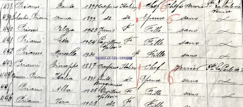 Originaires de Crespina (Toscane), Dante Priami, verrier, son épouse Anna et leur famille ; Giuseppe Priami, verrier, son épouse Italia et leur famille habitent place du Petit Tremblay