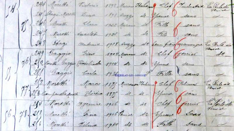 MORETTI Vittorio né en 1898 à Murano, industriel fondateur de La Perle de Venise, STAGGI MORETTI Dina, son épouse, Clara et Anacleto MORETTI, leurs enfants ; STAGGI Antonio, son beau-frère, manœuvre ; GAGGIO Gino, né en 1904 à Murano, verrier, MORETTI GAGGIO Téodolinda, son épouse ; MORETTI Marco né en 1875 à Murano, polisseur, CAMPANELLA MORETTI Teresa, son épouse ; MORETTI Avenire, né en 1906 à Murano, verrier, MORETTI Gina, son épouse, MORETTI Vilma, leur fille.