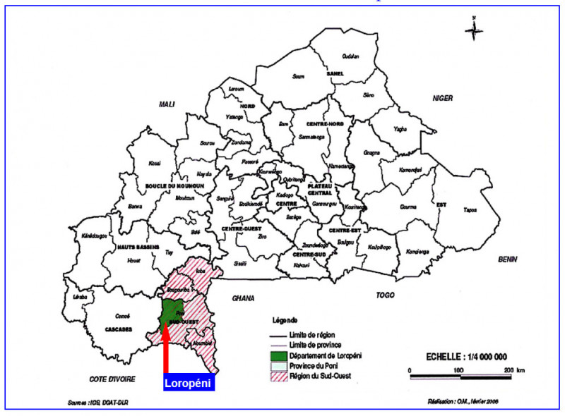 Le département de Loropéni fait partie des 10 départements de la province du Poni. Située au sud-ouest du Burkina Faso, cette province est limitée au nord par la province de la Bougouriba, à l’est par la République du Ghana, au sud par la République de la Côte d’Ivoire et à l’ouest par la province de la Comoé.