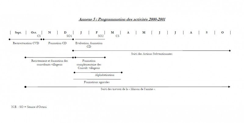 Ensuite, l’état de consommation du Fonds de Développement Local (FDL) a été dressé avec le bilan des dépenses par domaines d’activités et au niveau global (cf. annexe 4). Enfin, l’EAC a terminé sa présentation avec la programmation des activités pour l’année 2000-2001. Cela concernait en particulier :