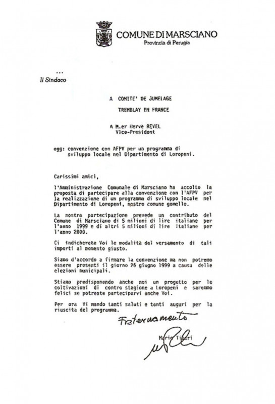 Traduction de la lettre de Mario TIBERI, maire de Marsciano
