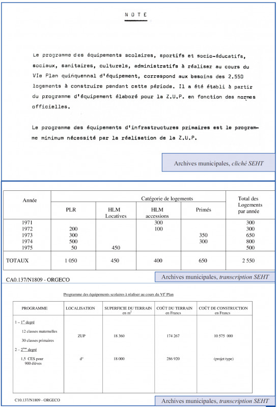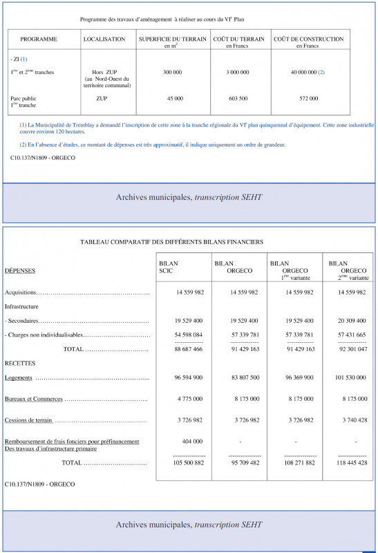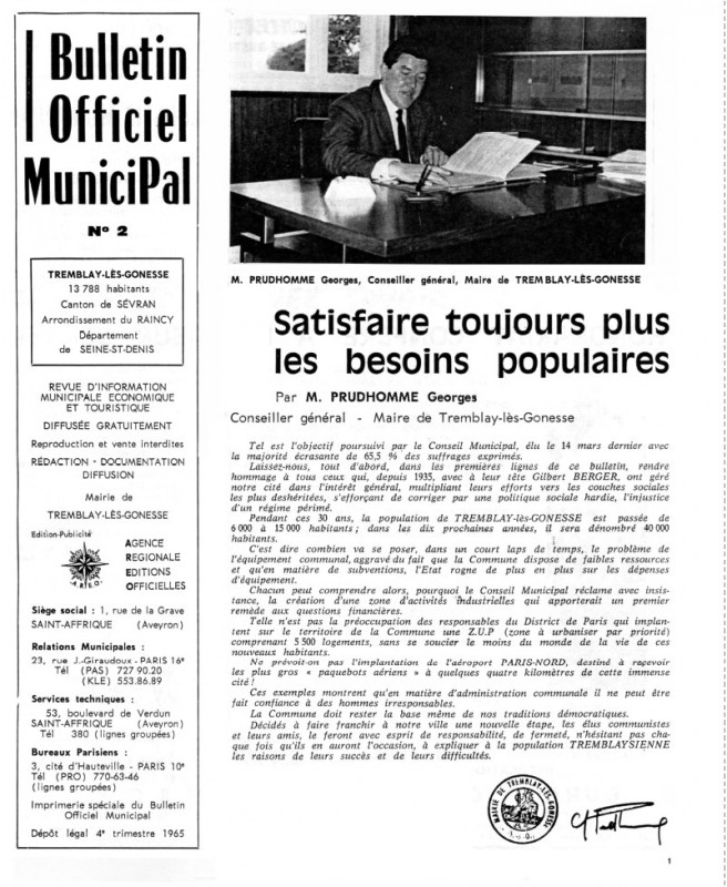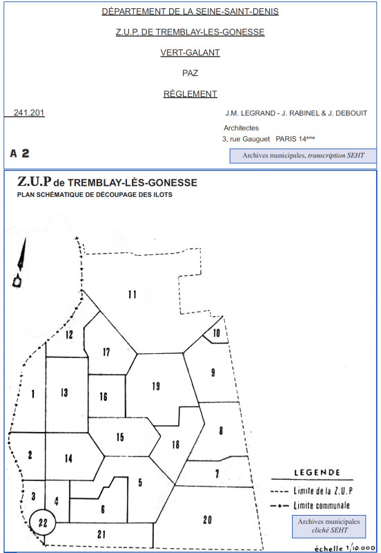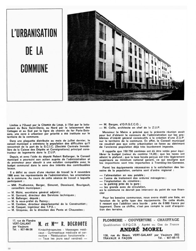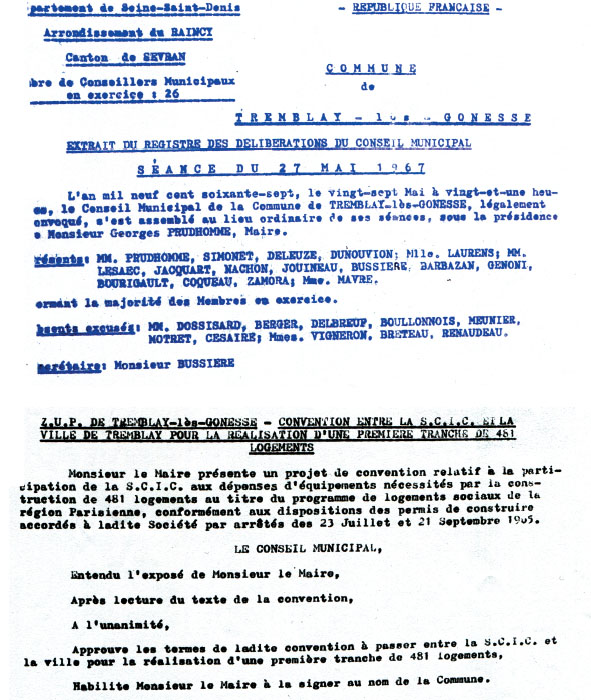 La dernière en date s’est tenue à la Mairie de Tremblay-lès-Gonesse, le 7 janvier 1965 ; en présence de Monsieur le sous-Préfet du RAInCy, avec la participation des représentants : du District de la Région de Paris, des Ponts-et-Chaussées, de la délégation départementale du MRL*, de l’architecte en chef de la ZUP et d’ORGECO, organisme conseil de la Commune en cette affaire.