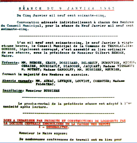 Séance du Conseil Municipal de Tremblay-lès-Gonesse du 09/01/1965