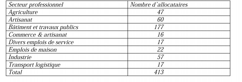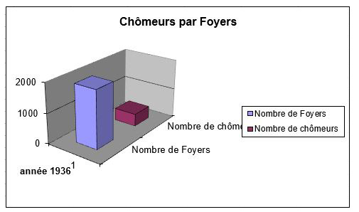 Nous disposons des états de paiement des allocations de chômage, documents qui recensent de façon exhaustive les chômeurs de la commune, avec émargement des intéressés. Pour la période du 27 décembre au 31 décembre 1936, nous relevons 413 allocataires, dont 49 femmes et 364 hommes. Ils sont répertoriés dans 115 professions qui peuvent être regroupées en 8 familles de métiers.
